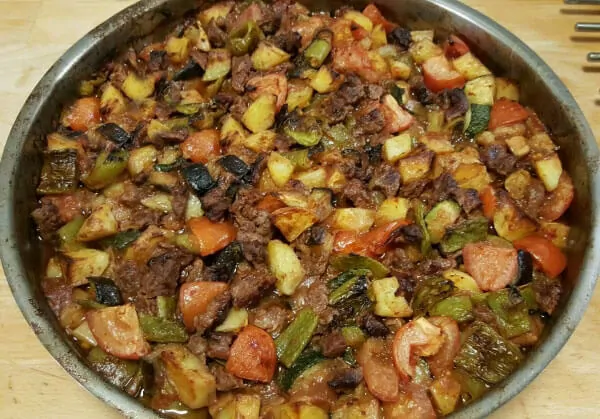 Als erstes schneiden Sie die Gemüsen klein und frittieren oder braten es nacheinander. Hacken Sie das Fleisch klein und schneiden Sie die Tomaten in Würfel. Geben Sie alle Zutaten auf das Blech. Gießen Sie die Mischung aus Tomatenpaste, Wasser, Salz und Gewürze darüber und mischen Sie das Ganze ordentlich. Backen Sie das Allerlei aus dem Ofen bei 225 Grad vorgeheizten Ofen ungefähr 55-60 Minuten. Fertig!