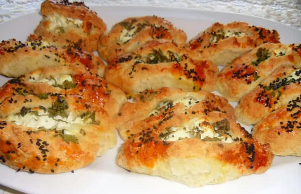 Als erstes geben Sie die Butter, das Öl und den Joghurt einer Schale zu und rühren es. Geben Sie den Salz und den Backpulver dazu. Dann geben Sie allmählich das Mehl dazu. Der Teig soll eine relativ weiche Konsistenz haben. Er soll „so weich, wie das Ohrläppchen“ werden. Nehmen Sie ein Stück von dem Teig ab und rollen Sie es aus. Geben Sie von der Füllung darauf und formen Sie es, wie auf dem Bild. Bestreichen Sie es mit Eidotter und streuen Sie Sesam darüber. Backen Sie die Börek mit Käse bei 180 Grad vorgeheizten Ofen bis es ihre Farbe einnimmt. Fertig!