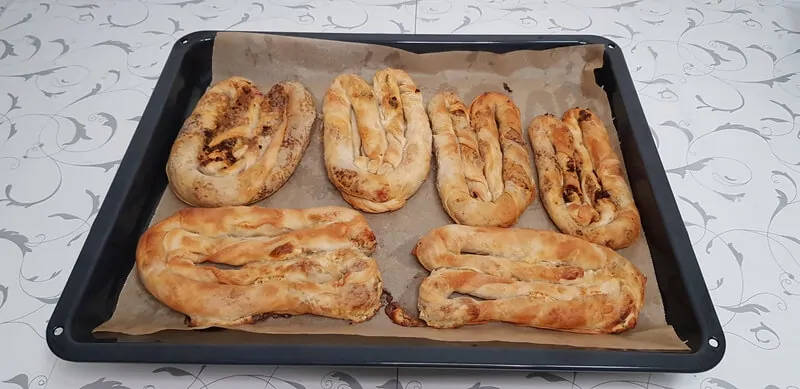 - Börek auf das Blech legen und bei 185 Grad vorgeheizten Ofen backen bis es goldbraun wird