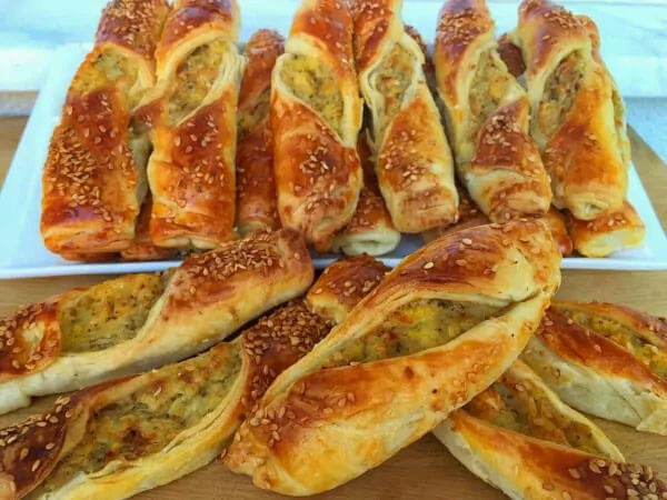 Als erstes bereiten Sie die Füllung zu. Geben Sie alle Zutaten außer die Zwiebel und das Öl einer Schale zu und mischen es ordentlich. Braten Sie die Zwiebel in einer Pfanne mit Öl und geben Sie es ebenfalls der Schale zu. Rühren Sie es. Dann bereiten Sie den Teig zu. Geben Sie alle Zutaten für den Teig einer Schale zu und kneten Sie es. Teilen Sie den Teig in 10 gleichgroße Stücke und drehen Sie es jeweils auf. Schmieren Sie Butter darauf und stapeln Sie jeweils 5 Teile aufeinander. Drehen Sie beide Stapel auf und schneiden Sie es so, dass Sie 12 Rechtecke haben (siehe Foto). Geben Sie von der Füllung darauf und formen Sie es, wie auf den Fotos. Schmieren Sie Eidotter darauf und streuen sie Schwarzkümmel darüber. Legen Sie es auf das Blech mit Backpapier und backen Sie es bei 180 Grad vorgeheizten Ofen bis es ihre Farbe einnimmt. Fertig!