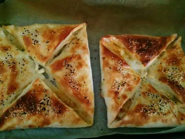 Als erstes waschen sie ordentlich den Spinat und lassen es im Wasser. Schneiden sie die Zwiebel dünn und braten sie es mit etwas Öl in einer Pfanne. Geben sie den Paprikapulver dazu und rühren sie es. Schneiden sie den Spinat klein und geben sie es der Pfanne zu. Braten sie es weiter. Streuen sie Salz darüber und legen sie den Deckel darauf. Lassen sie es kochen. Wenn der Spinat sein Wasser ablässt und wieder einzieht geben sie den Pfeffer dazu. Rühren sie es noch einmal und nehmen sie die Pfanne vom Herd. Danach geben sie die Milch, den Öl und das Mineralwasser einer Schale zu und mischen sie es. Legen sie das erste Yufkablatt auf die Arbeitsfläche und schmieren sie die Soße darauf. Falten sie zwei Seiten, die gegenüber liegen nach innen und schmieren sie noch einmal von der Soße darauf. Dann falten sie die anderen beiden Seiten nach innen und schmieren wieder von der Soße darauf. Nun sollten sie ein Quadrat haben. Geben sie auf alle vier Seiten von der Mischung mit Spinat darauf und falten sie es wie ein Briefumschlag. Dasselbe machen sie mit den anderen Yufkablättern. Diese können sie in einen Gefrierbeutel legen und einfrieren lassen. In Notfällen können sie es einfach aus dem Kühlschrank nehmen, Eidotter darauf schmieren, Sesam darüber streuen und backen sie es bei 200 Grad vorgeheizten Ofen bis es ihre Farbe einnimmt. Fertig!