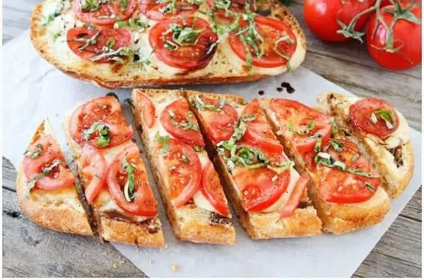 Danach geben Sie den Basilikum und die Tomaten darauf. Streuen Sie den Salz und den Pfeffer darüber. Geben Sie nach Wunsch Balsamico darauf. Erhitzen Sie die Brote mit Gemüsen eine Weile. Fertig!