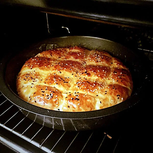 Backen Sie den Fladen mit Sesam bei 180 Grad vorgeheizten Ofen ungefähr 30-35 Minuten. Fertig!