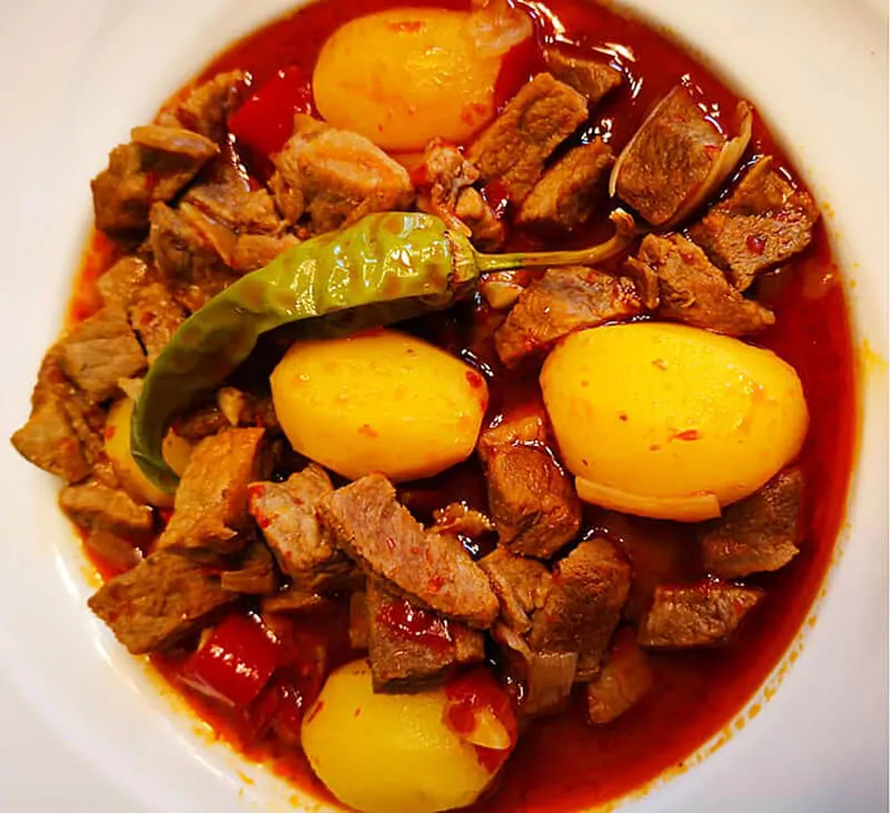 Als erstes hacken Sie das Fleisch klein. Braten Sie das Fleisch an bis es sein Wasser ablässt und wieder einzieht. Geben Sie das Öl, die Paprika, die Knoblauchzehe, den Paprikamark und die Kartoffeln dazu und braten Sie es kurz weiter. Gießen Sie ca. 250 ml Wasser darüber. Danach schmecken Sie es mit Salz und Pfeffer ab und lassen Sie den Fleischeintopf bei niedriger Hitze köcheln. Fertig!