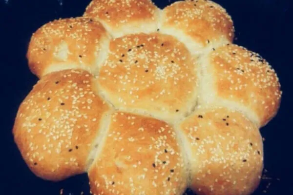 Als erstes geben Sie das Wasser, die Trockenhefe und den Zucker einer Schale zu und lassen es 10 Minuten warten. Geben Sie das Mehl und den Salz einer anderen Schale zu und mischen Sie es. Gießen Sie die Mischung aus Wasser, Trockenhefe und Zucker darüber und kneten Sie einen weichen Teig. Legen Sie ein Tuch darüber und lassen Sie es eine halbe Stunde ausspannen. Danach teilen Sie den Teig in 8 gleichgroße Stücke und kugeln es. Legen Sie es in Form eines Gänseblümchens auf das Blech, das Sie zuvor mit Öl einschmieren. Lassen Sie es weitere 15 Minuten ausspannen. Als nächstes bestreichen Sie es mit Olivenöl und streuen Sesam und Schwarzkümmel darüber. Backen Sie das Gänseblümchen Brot bei 200 Grad vorgeheizten Ofen bis es ihre Farbe einnimmt. Fertig!