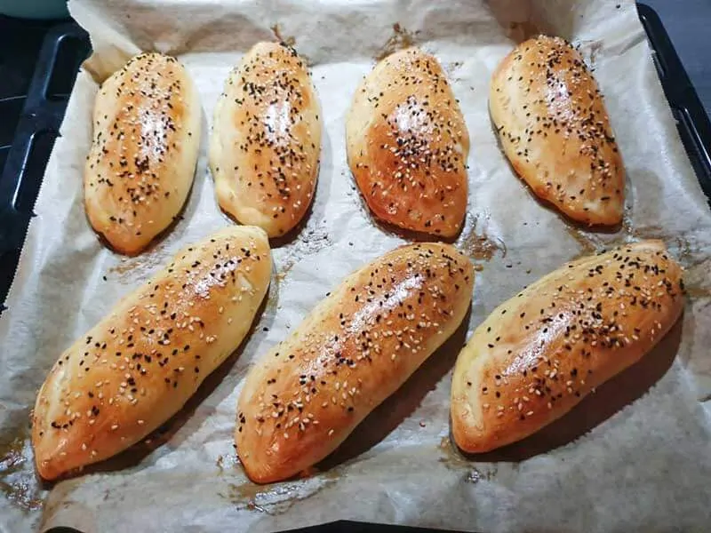 Danach nehmen Sie kleine Stücke von dem Teig ab und rollen Sie es aus. Geben Sie die Füllung darauf und formen Sie es. Bestreichen Sie es mit Eigelb und streuen Sie nach Wunsch Sesam oder Schwarzkümmel darüber. Backen Sie das Gebäck mit Kartoffelfüllung bei 180 Grad vorgeheizten Ofen bis sie goldbraun sind. Fertig!