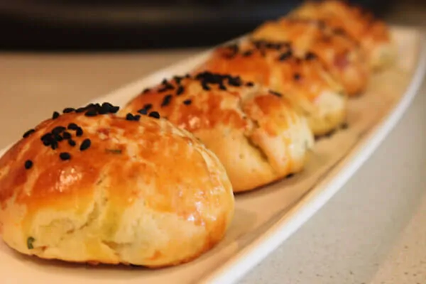 Als erstes geben Sie alle Zutaten außer das Mehl einer Schale zu und rühren es. Geben Sie allmählich das Mehl dazu und kneten Sie einen weichen Teig. Der Teig soll „so weich, wie das Ohrläppchen“ werden. Legen Sie ein Tuch darüber und lassen Sie es 10-15 Minuten ausspannen. Danach nehmen Sie kleine Stücke davon ab und formen es. Legen Sie es auf das Blech mit Backpapier und bestreichen Sie es mit Eidotter. Streuen Sie nach Wunsch Schwarzkümmel darüber. Backen Sie das Gebäck mit Käse bei 190-200 Grad vorgeheizten Ofen ungefähr 20-25 Minuten. Fertig!