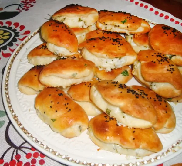 Als erstes geben Sie nacheinander alle Zutaten für den Teig einer Schale zu und kneten Sie einen weichen Teig. Nehmen Sie kleine Stücke von dem Teig ab und rollen Sie es aus. Geben Sie die Füllung darauf und formen Sie es. Legen Sie es auf das Blech mit Backpapier und bestreichen Sie es mit der Mischung aus Eidotter und Öl. Nach Wunsch können Sie Sesam oder Schwarzkümmel darüber streuen. Backen Sie das Gebäck mit Käse bei 200 Grad bis es ihre Farbe einnimmt. Fertig!