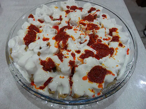 Schneiden Sie die Teigtaschen klein und legen Sie es in das Glasblech. Gebe Sie den Knoblauch-Joghurt und den gebratenen Tomatenmark darauf. Die gefüllten Teigtaschen sind fertig zum servieren.