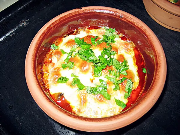 Als letztes geben Sie es in die kleinen Tontöpfe. Legen Sie Goudakäse darüber und backen Sie das Hähnchen mit Champignons bis der Käse goldbraun wird. Streuen Sie dann die Petersilie darüber. Fertig!