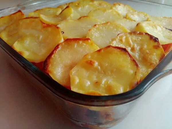 Als erstes schneiden Sie die Kartoffel in Scheiben und hacken das Fleisch klein. Braten Sie das Fleisch in einer Pfanne mit Öl. Geben Sie die Zwiebel und die Paprika dazu. Braten Sie es weiter und geben Sie die Tomatenpaste und die Gewürze dazu. Dann gießen Sie das Wasser darüber und lassen es eine Weile kochen. Nehmen Sie die Pfanne vom Herd. Als nächstes legen Sie die Kartoffel auf das Blech und verteilen das Fleisch darüber. Legen Sie eine Reihe Tomaten und darauf die restlichen Kartoffel. Schmieren Sie Öl darüber. Backen Sie das Hähnchen und Kartoffel aus dem Ofen bei 180 Grad vorgeheizten Ofen. Fertig!