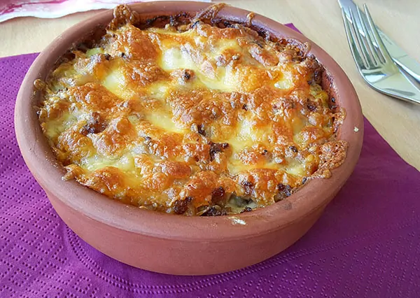 Als nächstes geben Sie die Kartoffeln der Hackfleischmischung zu und rühren Sie es. Geben Sie es in das Glasblech oder verteilen Sie es in kleine Tontöpfe. Geben Sie die Bechamelsauce dazu. Backen Sie den Kartoffel Moussaka bei 150 Grad vorgeheizten Ofen ungefähr 30 Minuten. Als letztes streuen Sie den Goudakäse darüber und backen Sie es bis der Käse goldbraun wird. Fertig!