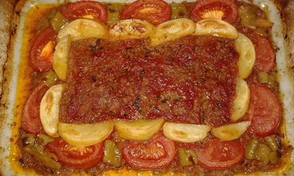 Geben Sie alle Zutaten für das Fleisch einer Schale zu und mischen Sie es ordentlich. Geben Sie die Mischung in das Glasblech und verteilen Sie es gleichmäßig. Dann geben Sie den Tomatenmark, das Öl und das Wasser einer Schale zu und rühren Sie es. Gießen Sie es auf das Fleisch. Legen Sie die Tomaten, die Paprika und die Kartoffeln darauf uns backen Sie es bei 200 Grad vorgeheizten Ofen bis es ihre Farbe einnimmt. Der Kebab im Blech ist fertig zum servieren.