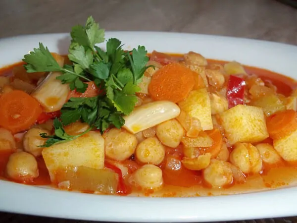 Als erstes geben Sie die Zwiebel, die Paprika und die Karotten einem Kochtopf zu. Gießen Sie etwas Olivenöl darüber und braten Sie es. Geben Sie den Tomatenmark, die Tomaten die Kartoffel und das Wasser dazu. Lassen Sie es kochen. Danach geben Sie die Kichererbsen, die Knoblauchzehe, den Salz und den Zucker dazu. Lassen Sie es kochen bis die Kartoffel weich werden. Als letztes geben Sie nach Wunsch die Petersilie und den Zitronensaft darauf. Die Kichererbsen mit Gemüse sind fertig zum servieren.
