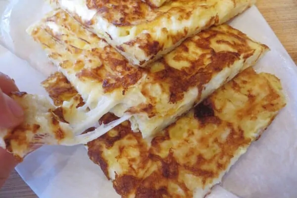Als erstes geben Sie die Eier, die Milch und das Öl einer Schale zu und rühren Sie es. Legen Sie das erste Yufkablatt auf die Arbeitsfläche und geben Sie Käse darauf. Falten Sie es zu und manschen Sie es in die Mischung aus Eier, Milch und Öl. Braten Sie es beidseitig in einer Pfanne, die Sie zuvor erhitzen. Dasselbe machen Sie mit allen Yufkablättern. Der Pfannkuchen mit Ei und Käse ist fertig zum servieren.