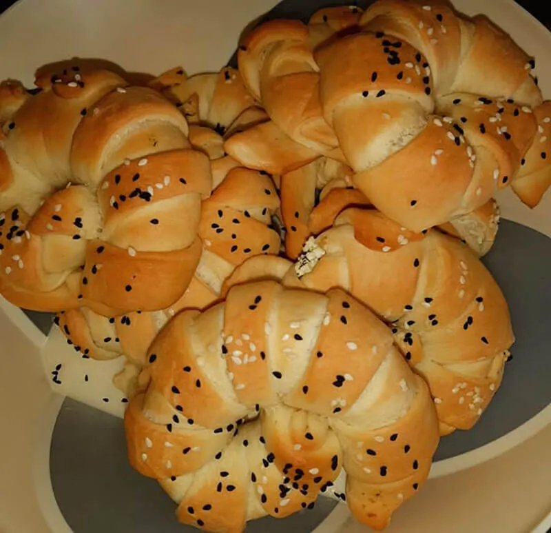 Danach rollen Sie die Kugeln jeweils aus und geben Sie die Mischung aus Schafskäse und Petersilie darauf (oder andere Füllung). Formen Sie es, wie auf den Bildern. Legen Sie es auf das Blech mit Backpapier und bestreichen Sie es mit der Mischung aus Milch und Eigelb. Streuen Sie Sesam und Schwarzkümmel darüber. Backen Sie die türkischen poğaça mit Käse bei 160 Grad vorgeheizten Ofen (Ober-/Unterhitze) bis es goldbraun wird. Fertig!