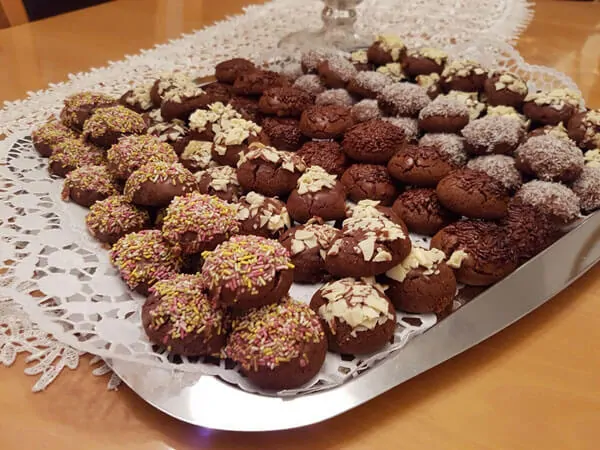Als erstes geben Sie nacheinander alle Zutaten für den Teig einer Schale zu und kneten Sie einen weichen Teig. Legen Sie ein Tuch darüber und lassen Sie es ungefähr eine halbe Stunde ruhen. Dann nehmen Sie kleine Stücke von dem Teig ab und kugeln Sie es. Legen Sie es auf das Blech mit Backpapier. Backen Sie es bei 180 Grad vorgeheizten Ofen bis es ihre Farbe einnimmt. Lassen Sie es abkühlen. Geben Sie die geschmolzene Schokolade darauf und dekorieren Sie es nach Wunsch. Die Schokoplätzchen sind fertig zum servieren.