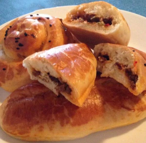Als erstes bereiten Sie die Füllung zu. Schneiden Sie die Zwiebel klein und geben Sie es mit dem Öl einer Pfanne zu. Braten Sie es einige Minuten und geben Sie das Hackfleisch dazu. Braten Sie es weiter und geben Sie die Tomatenpaste dazu. Schneiden Sie die anderen Zutaten klein und geben Sie es ebenfalls der Pfanne zu. Geben Sie den Salz und die Gewürze dazu und braten Sie das Ganze ungefähr 10 Minuten. Nehmen Sie die Pfanne vom Herd und lassen Sie die Füllung abkühlen. In dieser Zeit bereiten Sie den Teig zu. Geben sie das Wasser, die Hefe und den Zucker einer Schale zu und rühren Sie es. Geben Sie den Salz und allmählich das Mehl dazu. Kneten Sie einen weichen Teig. Nehmen Sie kleine Stücke von dem Teig ab und drehen Sie es auf. Geben Sie von der Füllung darauf und formen Sie es. Legen Sie es auf das Blech mit Backpapier und schmieren Sie Eidotter darauf. Streuen Sie Schwarzkümmel darauf und lassen Sie die Teigtaschen mit Hackfleisch bei 200 Grad vorgeheizten Ofen backen bis es ihre Farbe einnimmt. Fertig!