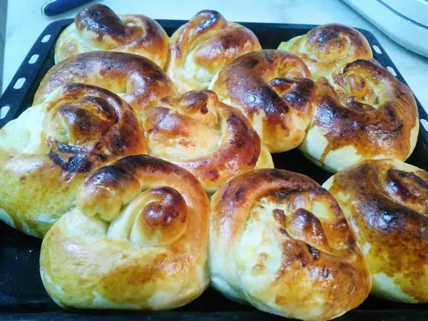 Nehmen Sie kleine Stücke von dem Teig ab und rollen Sie es aus. Geben Sie die Mischung aus Kartoffeln und Käse darauf und rollen Sie es ein. Formen Sie es und legen Sie es auf das Blech mit Backpapier. Lassen Sie es ungefähr eine halbe Stunde ruhen.