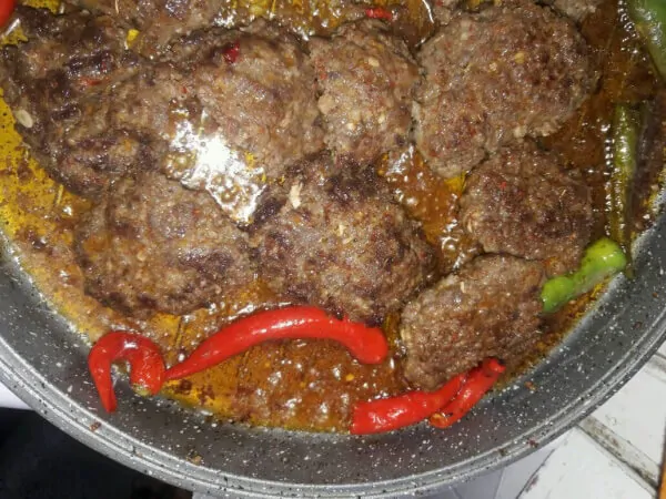 Geben sie alle Zutaten einer Schale zu und mischen sie es ordentlich. Nehmen sie kleine Stücke von der Mischung ab und formen sie es. Braten sie es in einer Pfanne mit etwas Öl. Die türkischen Frikadellen sind fertig zum servieren.