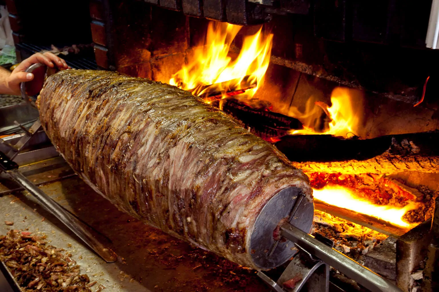 Das marinierte Fleisch auf Spieße stecken und über Holzfeuer grillen. Die Außenseite grillt schneller – das gebräunte Fleisch wie beim Döner abschneiden und den Rest weitergrillen.