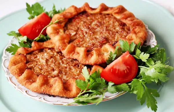 Als erstes geben Sie das Wasser, das Ei und den Salz einer Schale zu und rühren Sie es. Geben Sie allmählich das Mehl dazu und kneten Sie einen weichen Teig. Dann geben Sie alle Zutaten für den Belag nacheinander einer Schale zu und mischen Sie es ordentlich. Als nächstes nehmen Sie kleine Stücke von dem Teig ab und rollen Sie es aus. Geben Sie den Belag darauf und verteilen Sie es gleichmäßig. Formen Sie es und braten Sie es in einem Kochtopf mit Öl. Braten Sie zuerst die obere Seite, damit das Hackfleisch nicht abfällt. Das türkische Gebäck ist fertig zum servieren.