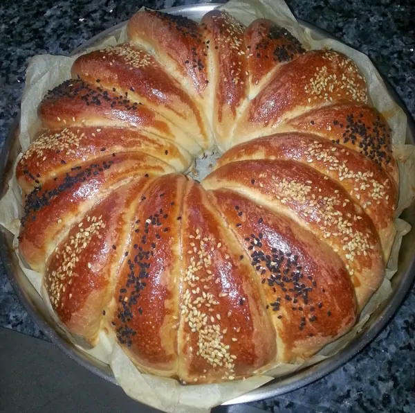 Als erstes geben Sie alle Zutaten für den Teig einer Schale zu. Kneten Sie es ordentlich und legen Sie ein Tuch darüber. Lassen Sie es ungefähr eine Stunde ausspannen. Danach teilen Sie den Teig in 15 gleichgroße Stücke und rollen Sie es aus. Bestreichen Sie es mit Olivenöl und legen Sie es auf das Blech (siehe Fotos). Legen Sie eine Tüte darüber und lassen Sie es ungefähr eine Stunde ausspannen. Als letztes bestreichen Sie es mit Eidotter. Backen Sie das türkische Gebäck bei 180 Grad vorgeheizten Ofen ungefähr 50 Minuten. Fertig!
