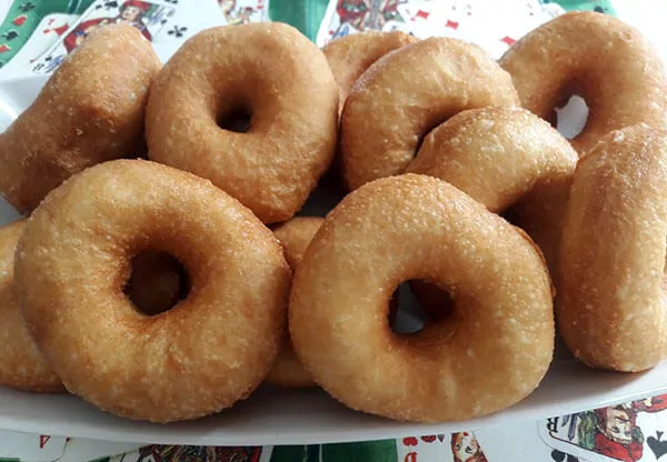 Als nächstes rollen Sie den Teig aus und schneiden Sie runde Stücke. Formen Sie es, wie ein Donut. Braten Sie das türkische Gebäck in einem Kochtopf mit Öl. Fertig!