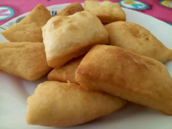 Als erstes geben Sie alle Zutaten einer Schale zu und kneten einen weichen Teig. Teilen Sie den Teig in zwei gleichgroße Stücke und drehen Sie es auf. Schneiden Sie es, wie auf den Fotos. Braten Sie das türkische Gebäck mit Backpulver in einer Pfanne mit Öl. Fertig!