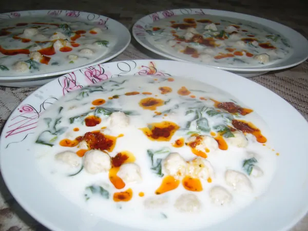 Als erstes geben Sie die Weizengrütze und das Ei einer Schale zu und rühren Sie es. Geben Sie das Mehl dazu und kneten Sie es ordentlich. Nehmen Sie kleine Stücke davon ab und kugeln Sie es. Danach geben Sie einem Kochtopf Wasser zu und lassen Sie es kochen. Streuen Sie Salz dazu und geben Sie die Klöße dazu. Lassen Sie es kochen und geben Sie den Spinat dazu. Dann nehmen Sie die Klöße und den Spinat aus dem Wasser und lassen Sie es abkühlen. Geben Sie den Knoblauch Joghurt dazu und rühren Sie es. Als letztes braten Sie die Zutaten für die Soße in einer Pfanne und geben Sie es auf den Knoblauch Joghurt. Die Weizengrütze Klöße mit Joghurt sind fertig zum servieren.